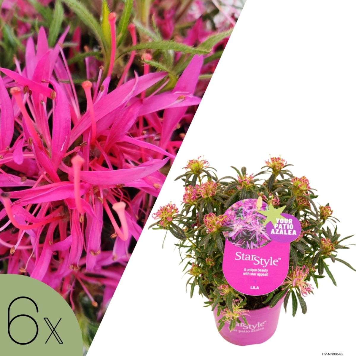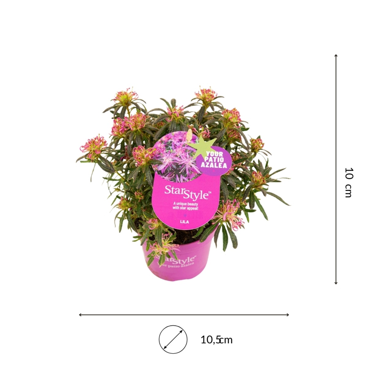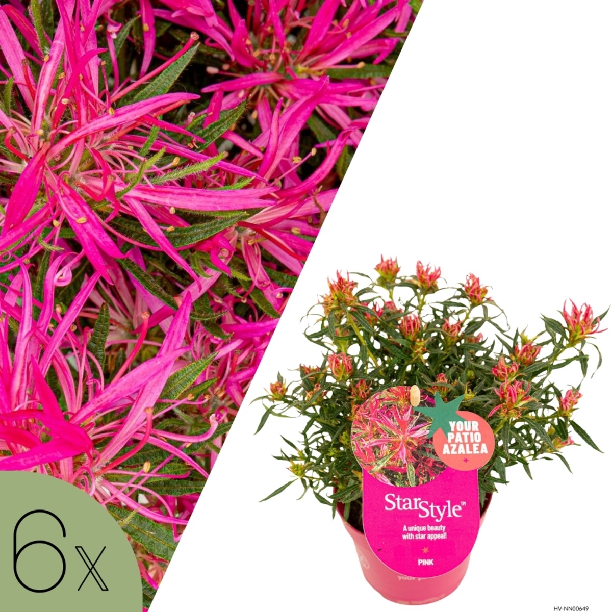 De StarStyle azalea's groeien compact tot circa 80 cm hoog en staan het liefst in de halfschaduw met weinig tot gemiddeld water. Ze worden geleverd als set van 6 planten (bij de Mix: 2 stuks per kleur) in 10,5 cm potten op circa 10 cm hoogte.