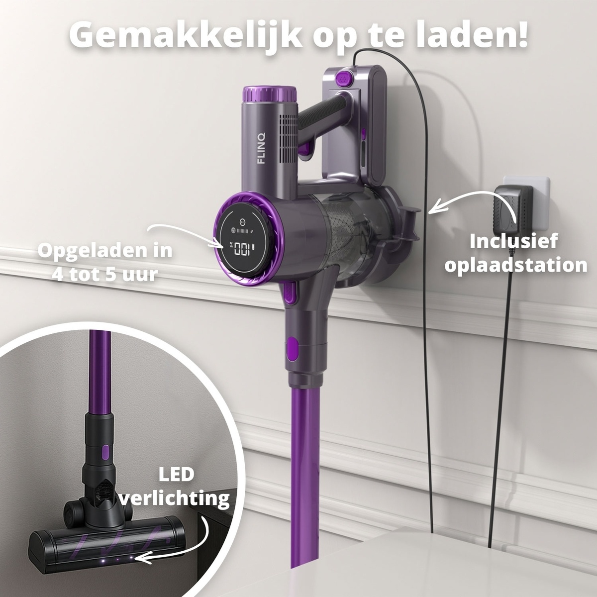 De V8 steelstofzuiger van FlinQ is ontwikkeld om het schoonmaken in huis zo eenvoudig mogelijk te maken. Met een sterke zuigkracht tot 20 kPa verwijdert u moeiteloos stof, kruimels en vuil van zowel harde vloeren als tapijt. Waar veel steelstofzuigers in deze prijsklasse minder vermogen hebben, biedt de V8 stofzuiger extra kracht voor een zichtbaar schoner resultaat.