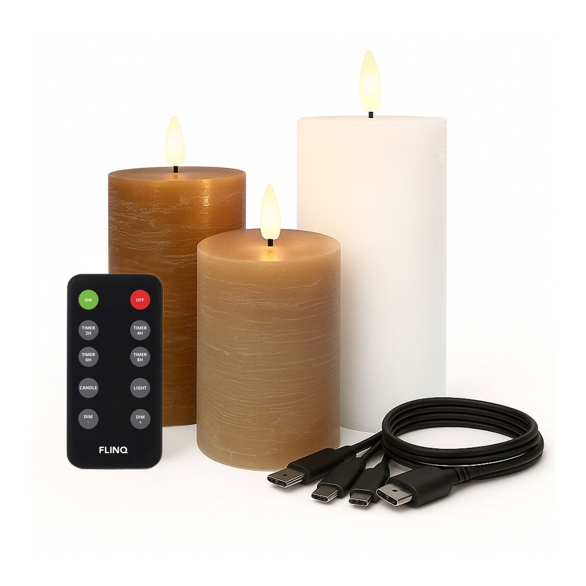 Haal de sfeer van echte kaarsen in huis, zonder zorgen over vuur of roet. Deze stijlvolle, oplaadbare LED-kaarsen van FlinQ combineren warme gezelligheid met modern gebruiksgemak. Een veilige en elegante oplossing voor elk moment van de dag.