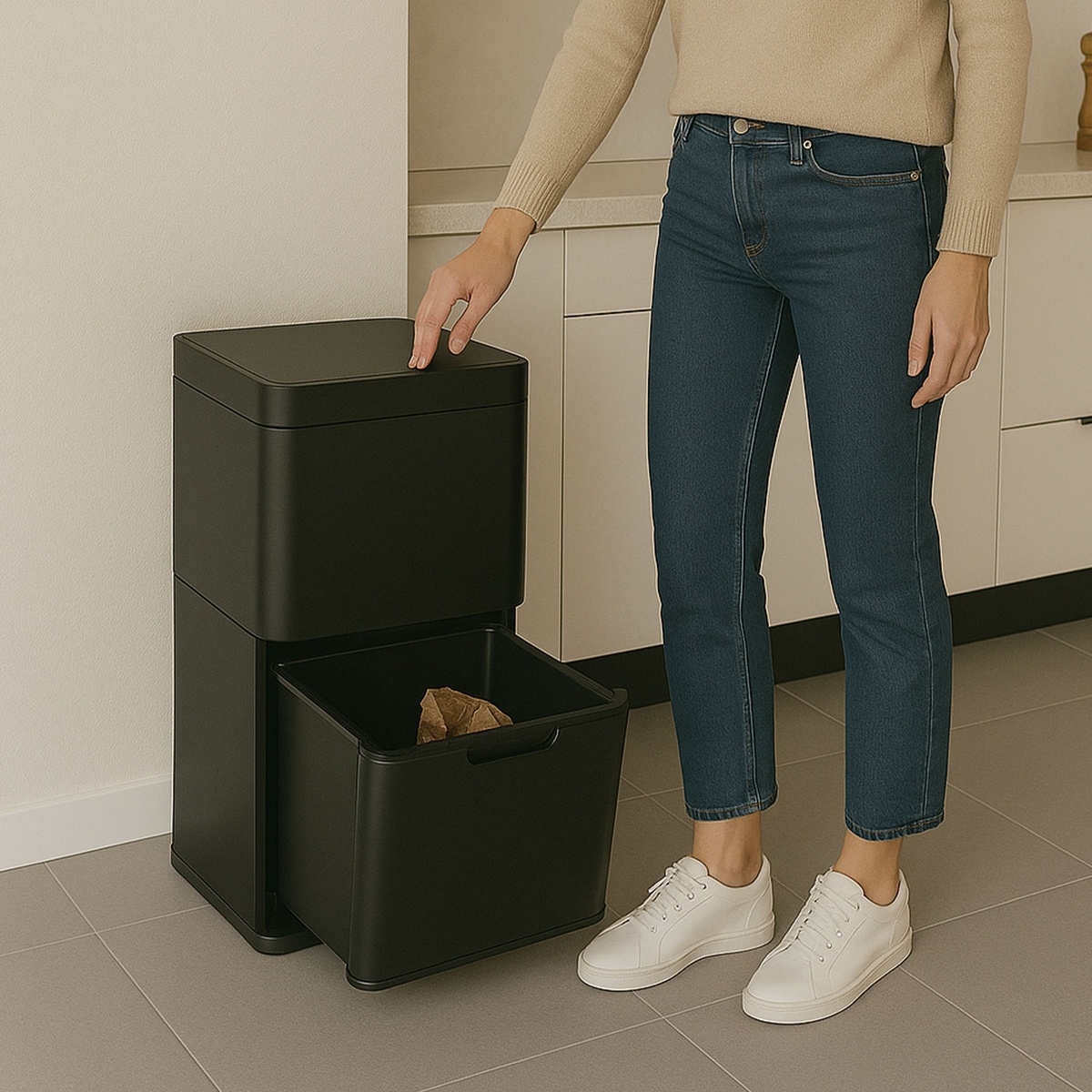 Het moderne roestvrij staal ontwerp past moeiteloos in zowel een klassieke als moderne keuken. De vingerafdrukbestendige coating zorgt ervoor dat de afvalemmer er netjes uit blijft zien, zelfs bij dagelijks gebruik. Het soft close systeem sluit de deksel geruisloos, wat prettig is in een rustige woonomgeving.