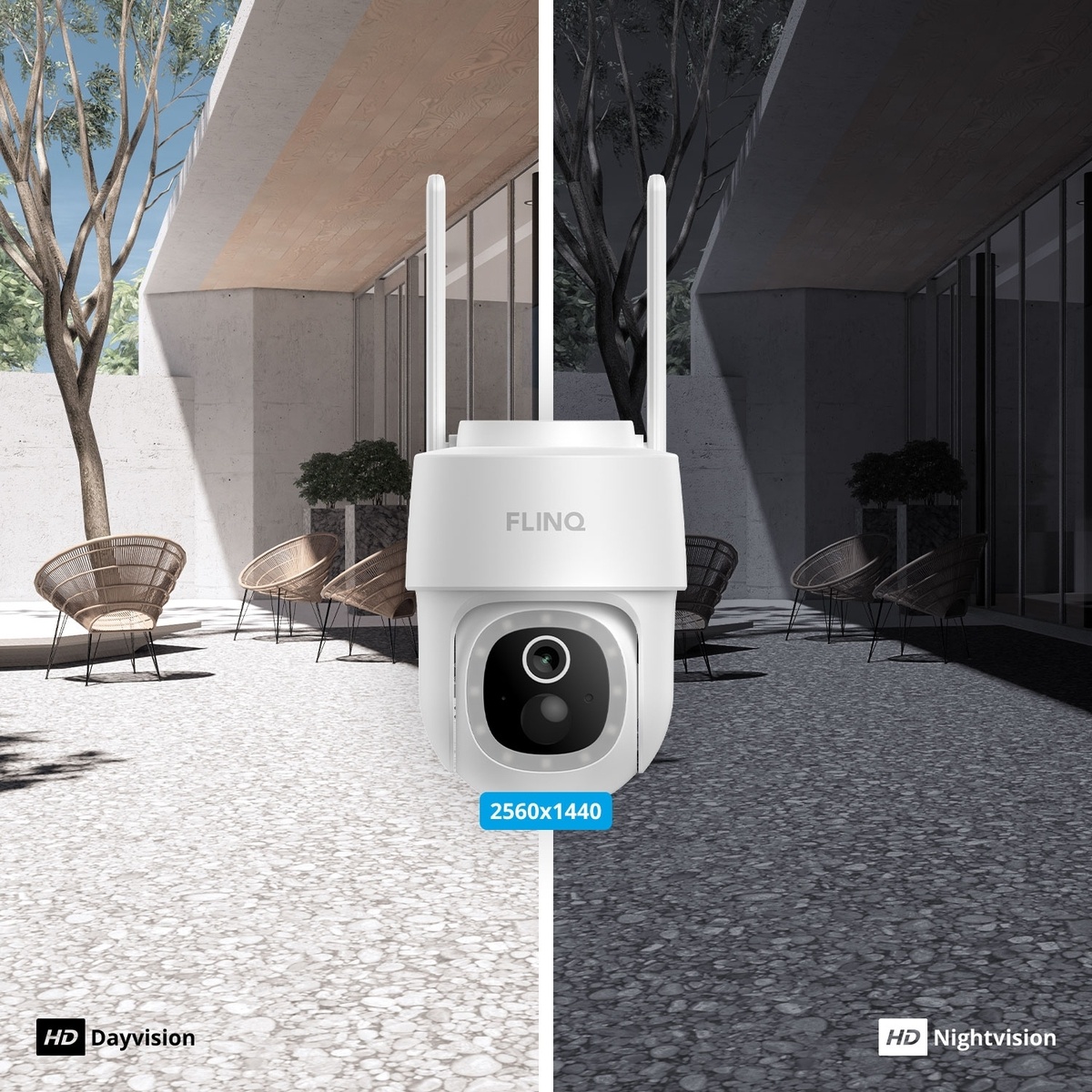 Weer of geen weer, deze IP65-gecertificeerde camera doet altijd zijn werk. Beelden slaat u veilig op via een microSD-kaart of in de FlinQ Cloud. Terugkijken, live meekijken of instellingen aanpassen doet u simpel via de gratis FlinQ App.