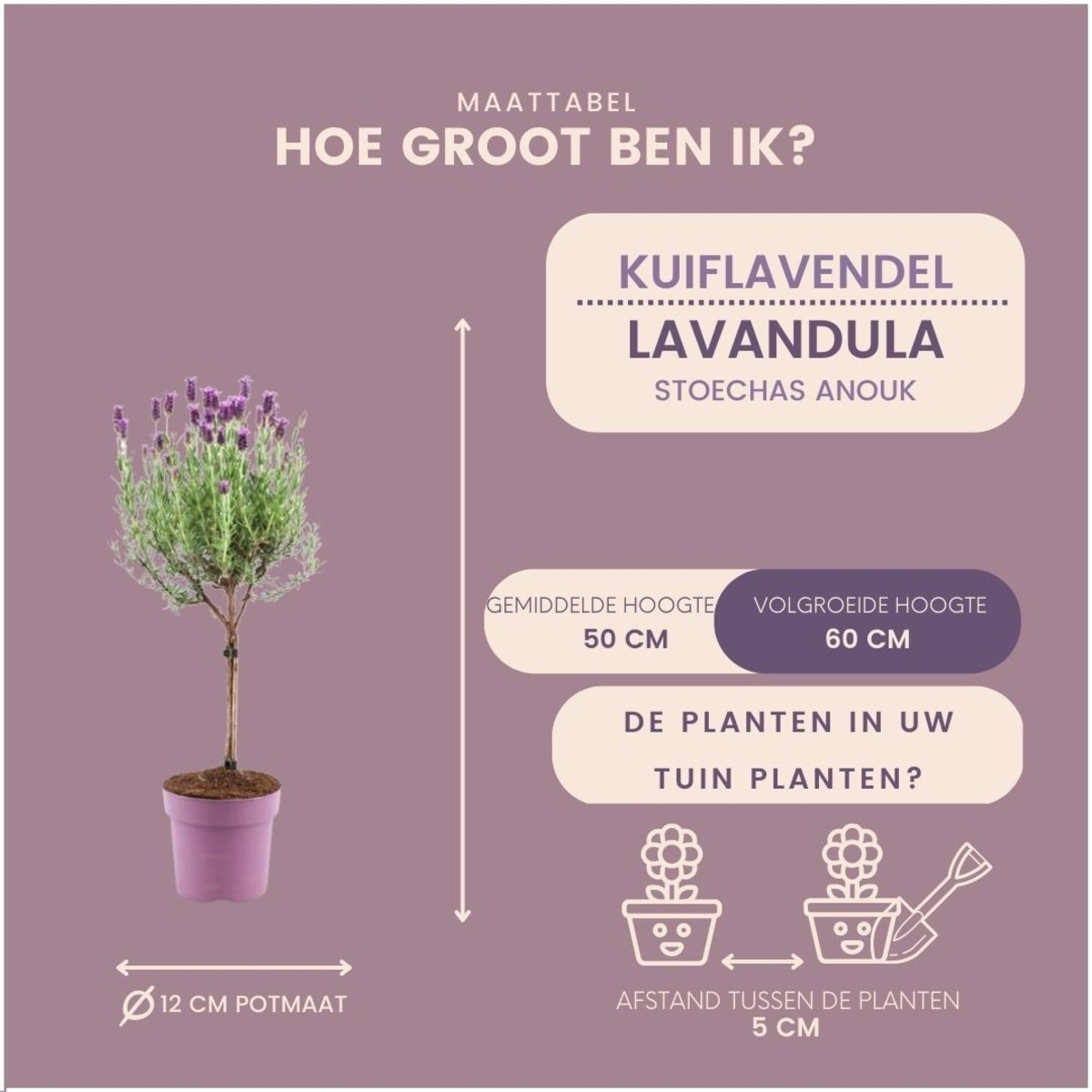 - Hoogte: Bij levering heeft de Lavendel stoechas 'Anouk' een hoogte van circa 45 cm.