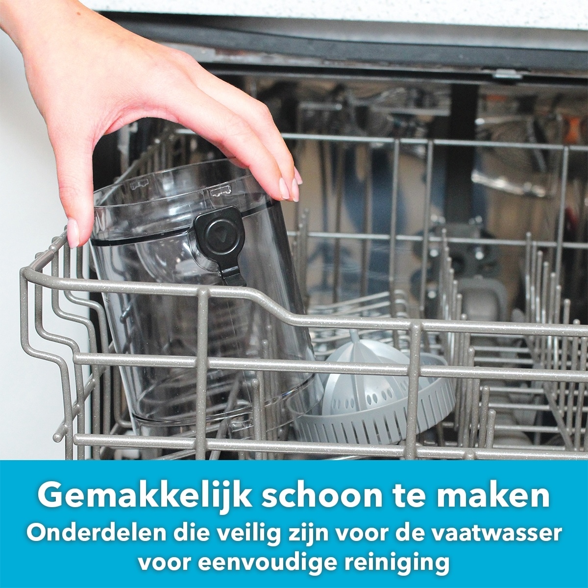 Met zijn draadloze en oplaadbare ontwerp past de sapcentrifuge gemakkelijk op elk aanrecht en kan hij moeiteloos worden opgeborgen. Bovendien zijn de onderdelen vaatwasmachinebestendig, waardoor schoonmaken een fluitje van een cent is. Ontdek de snelste en gemakkelijkste manier om vers en gezond sap te krijgen met de Hurricane Juicer!