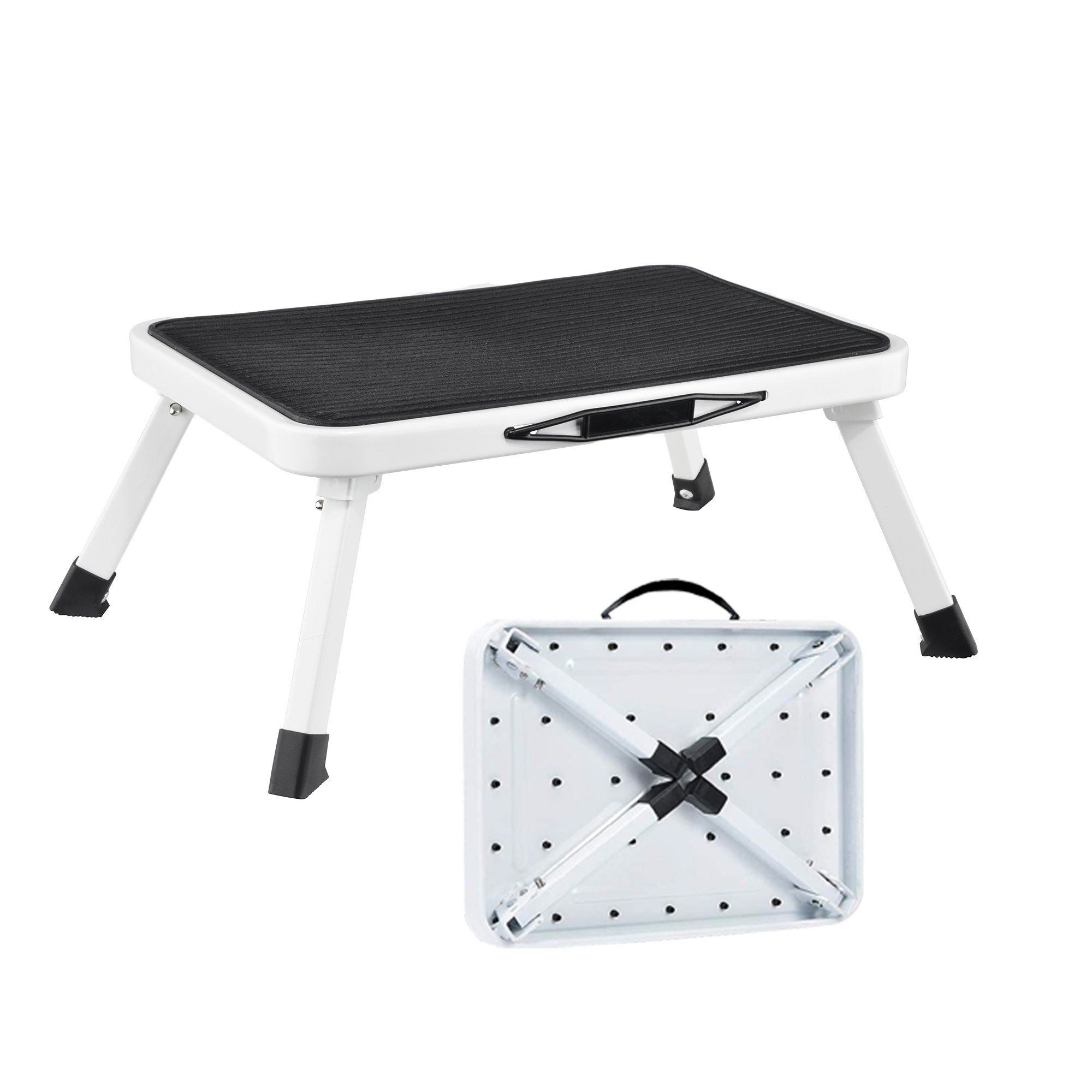 Het inklapbare opstapje kan belast worden tot wel 150 kg en blijft stabiel staan dankzij zijn sterke constructie van staal.