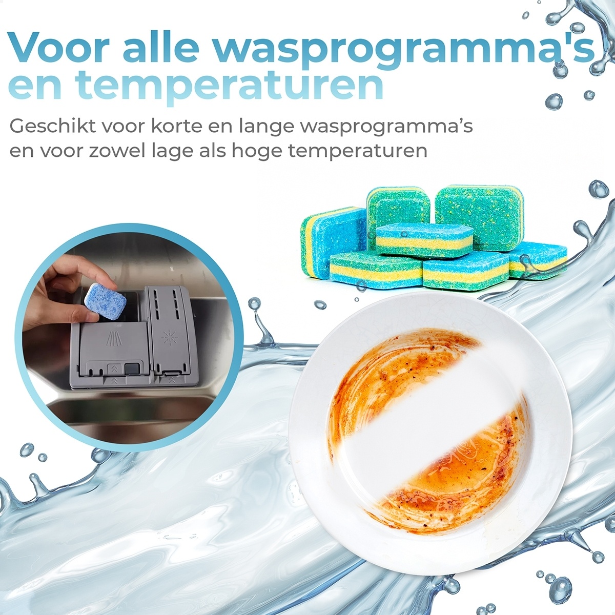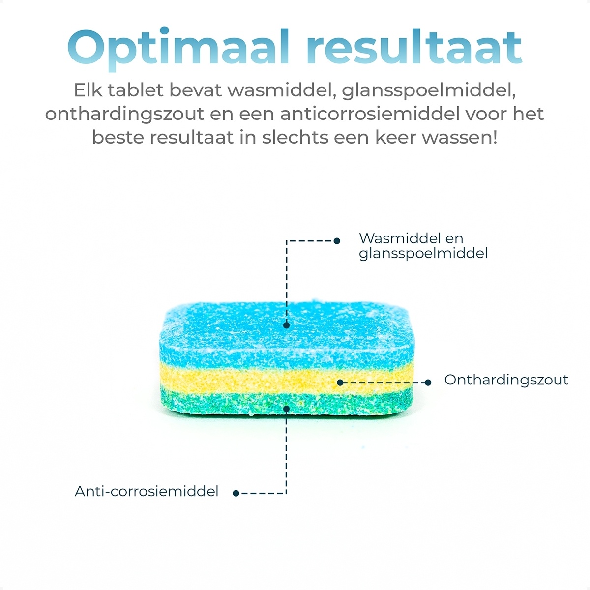 Wat deze tabletten echt speciaal maakt, is hun inhoud. Ze bevatten niet alleen reinigingsmiddel en glansspoelmiddel, maar ook onthardingszout en een middel tegen glascorrosie. Dit zorgt ervoor dat uw vaat niet alleen hygiënisch schoon wordt, maar ook fris en glanzend blijft, zonder kalkaanslag of witte waas op uw glazen.