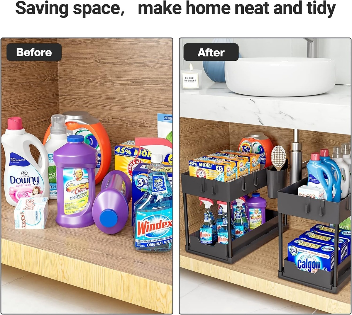 Hoewel ontworpen voor onder de gootsteen, voelt deze organizer zich net zo goed thuis in de voorraadkast, het washok of de badkamer. Overal waar u behoefte hebt aan meer overzicht en efficiëntie, biedt dit compacte systeem een stijlvolle oplossing.