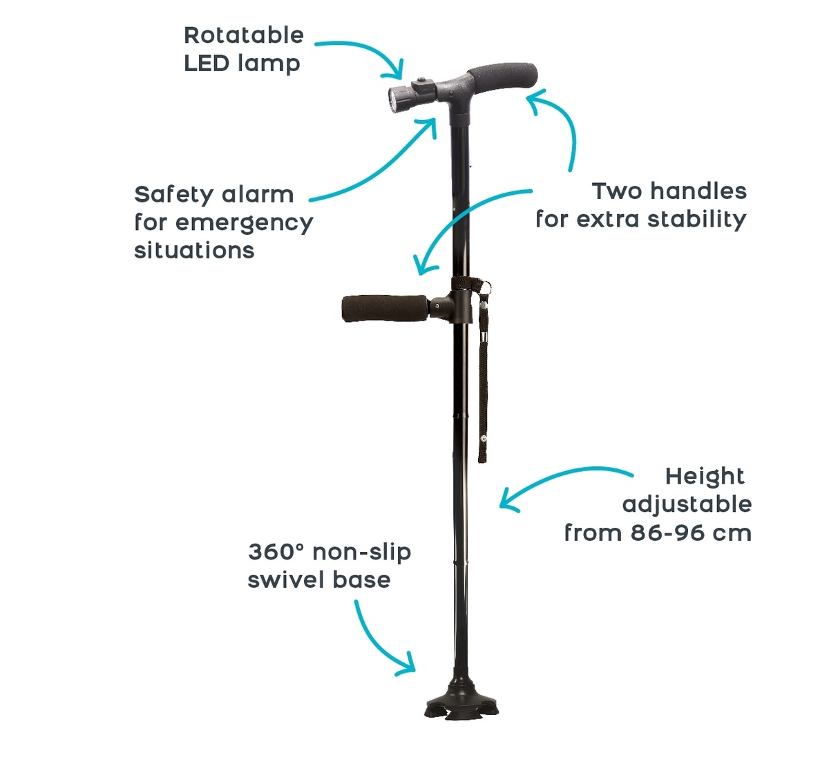 De Clever Cane wandelstok is een slimme wandelstok voor wie extra ondersteuning nodig heeft bij het lopen. Dankzij de stevige driepoot met antislipvoeten staat u stabiel op bijna elk oppervlak. Dit geeft u niet alleen meer zelfvertrouwen, maar ook meer bewegingsvrijheid in en rondom huis. En met de ingebouwde LED-lamp houdt u ook in het donker goed zicht op uw pad.