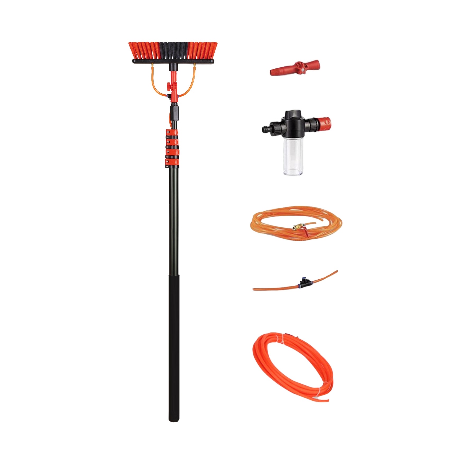 Schoonmaken was niet eerder zo gemakkelijk als met de uitschuifbare waterborstel. De wasborstel heeft een telescopische steel bestaande uit 4 delen die u tot maximaal 4,6 meter kunt uitschuiven. De telescopische waterborstel sluit u gemakkelijk aan op het waterleidingnet. De wasborstel is voorzien van een OGS-aansluiting die met het aansluitstuk past op een tuinslang. Zo stroomt het water direct naar de borstel. Verder beschikt de borstelkop over een zeepdispenser waardoor u oppervlakken niet apart hoeft in te zepen.