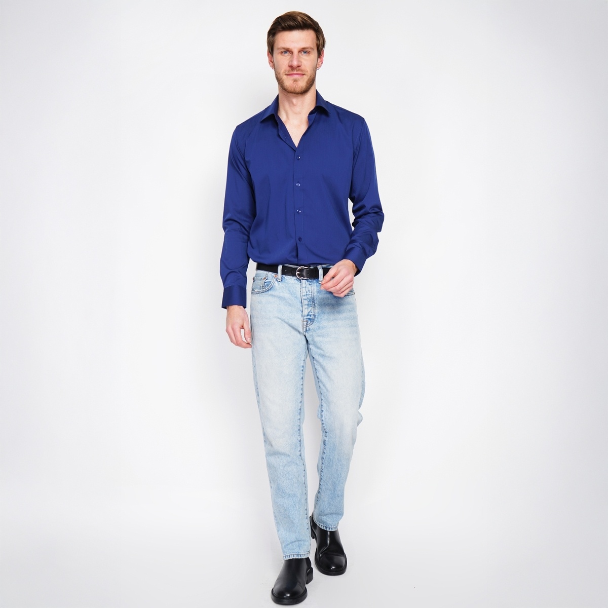Deze herenblouse is een stijlvol recht model blouse met klassieke kraag, tweeknoops manchet en een moderne uitstraling. Gemaakt van een stofmix met bamboe, polyester, microvezel en spandex voor optimaal draagcomfort en een perfecte pasvorm.